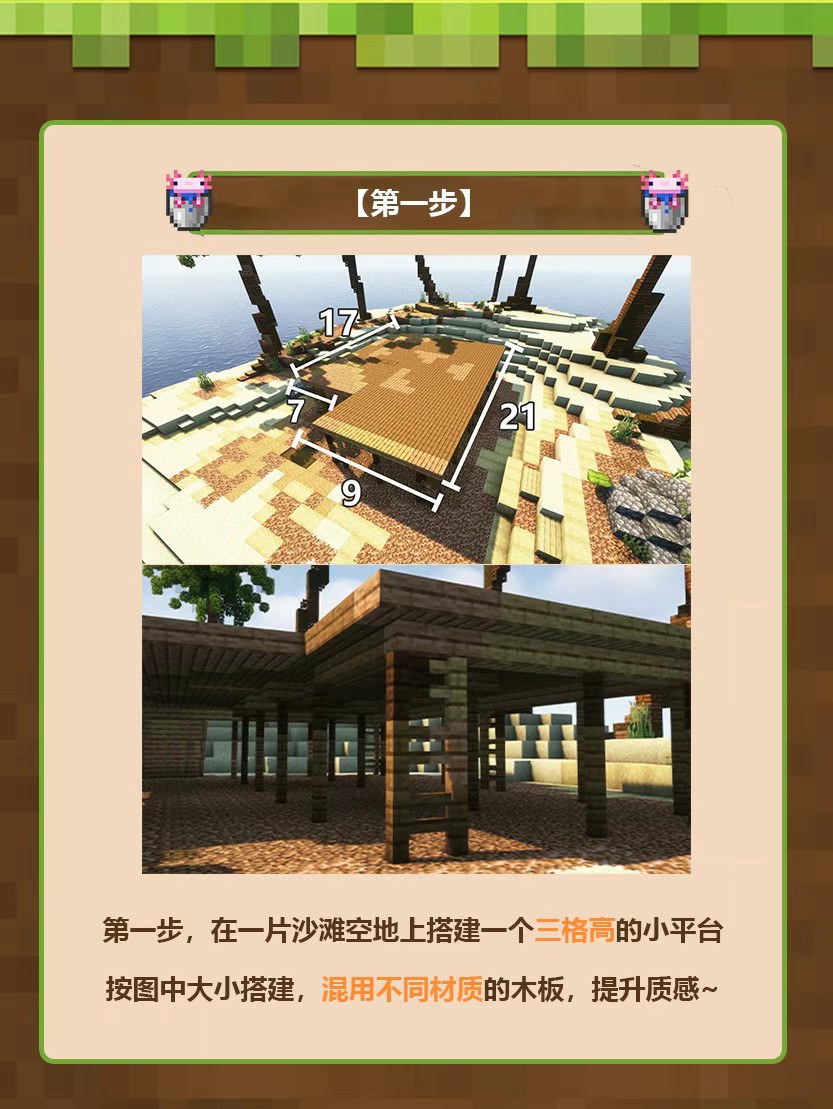 1、在一片沙滩空地上搭建一个三格高的小平台按图中大小搭建,混用不同材质的木板,提升质感~