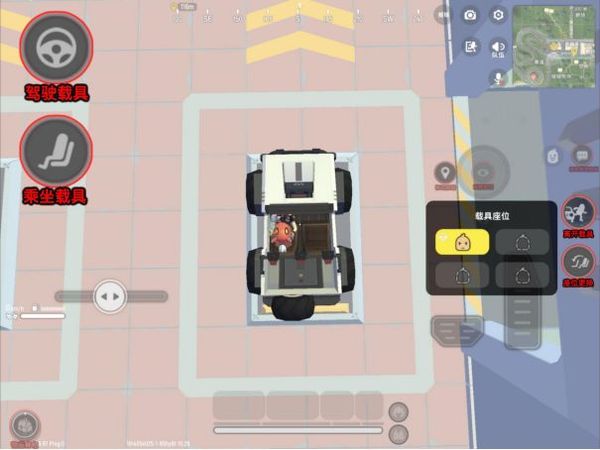 进入载具「载具操作按钮」消失,出现「载具驾驶按钮」「离开载具按钮」和「换座按钮」(点击后弹出座位选择框)