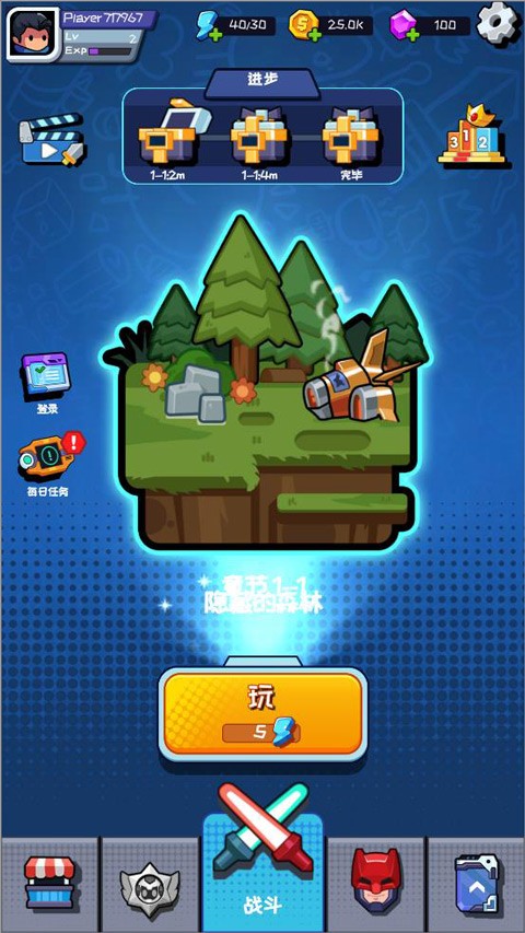 1、玩家通过新手引导完成模拟练习后,解锁商店、英雄和升级功能。