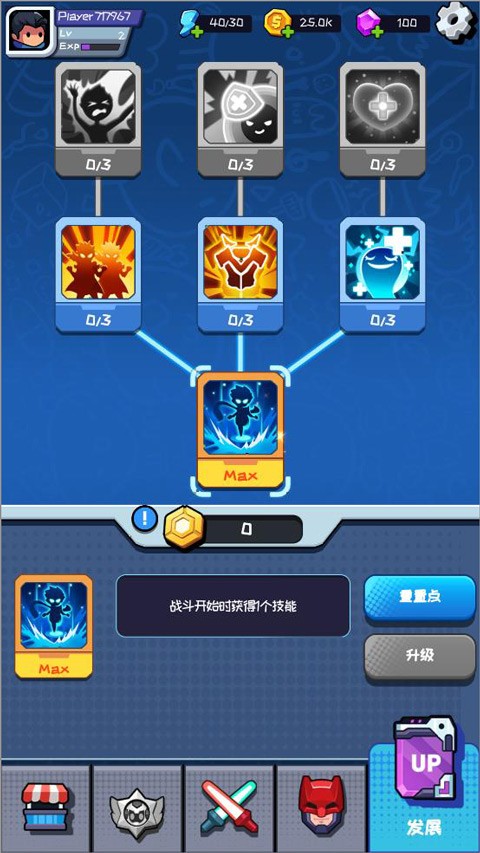 4、技能页面展示战斗中获得的技能,玩家可选择重点技能进行强化,为后续战斗做好准备。