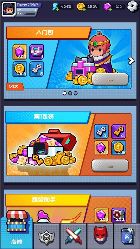 2、通关初始章节后,商店、英雄管理和升级等核心功能解锁,玩家可利用收集的钻石购买升级所需的道具和装备,进一步增强战斗力。