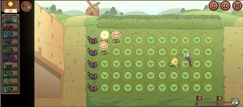 2、每一关选择的植物会在左侧放置,通过消耗阳光即可在场景中进行种植,在种植时会有图标标识可以种植的格子;