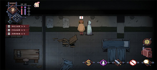 这里就开始有黑暗环境了,在走廊上是要靠手电筒和油灯提供照明的,而几个房间有电灯开关可以开灯,虽然有些灯是坏的。点行李图标,再点要用的物品,点使用,就可以啦!使用后行李图标上方会出现一个小太阳?的灯光标志。