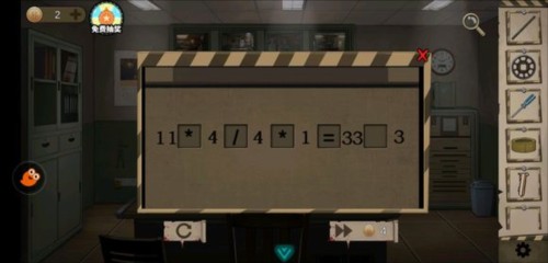 人偶手臂的指向,把右面墙上的大钟指针调到3点35分得到半把钥匙点击右边墙角钟下面的柜子,出现一道算式。从左面方框开始,在五个方框里依次输入运算符“*、/、*、=、/”,使等号两边的数字相等