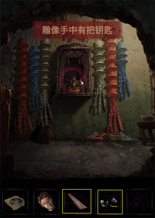 1、此处雕像用木板和石子拿到,从而获取“钥匙”。木偶头放在牌位上,用画笔画眼睛,获得房顶饰品。