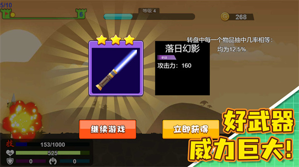 3、成功击败所有敌人数后进入下一关,积累金币用于解锁新武器与升级角色属性。