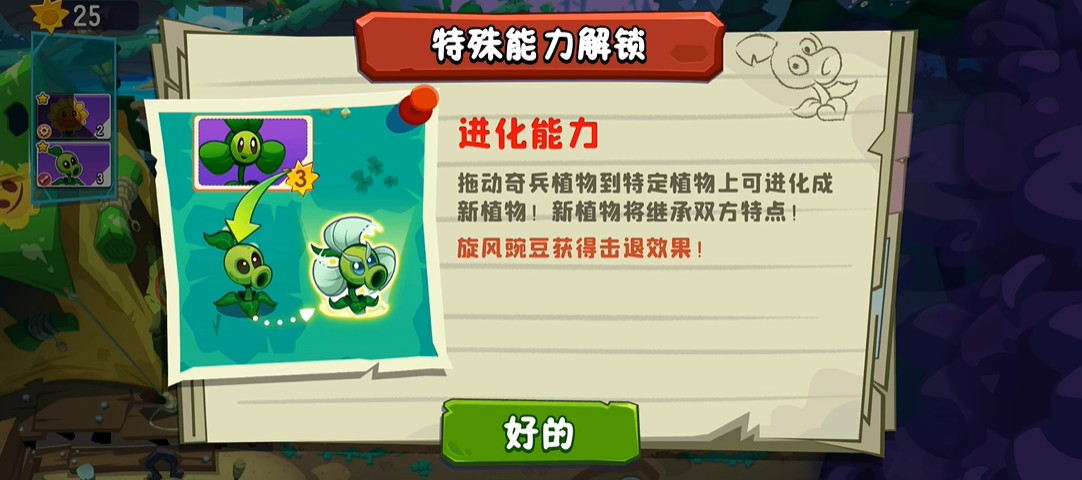 拖动奇兵植物到特定植物上可进化成新植物!新植物将继承双方特点!