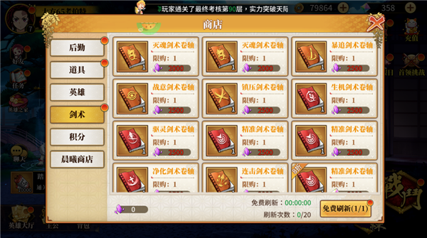 寻宝商店:只拿专武材料。剑术商店:免费刷,用碎片买连击、穿透等,新区优先升两级。