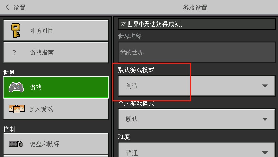 1、进入我的世界1.20基岩版游戏,先将默认游戏模式改为创造模式