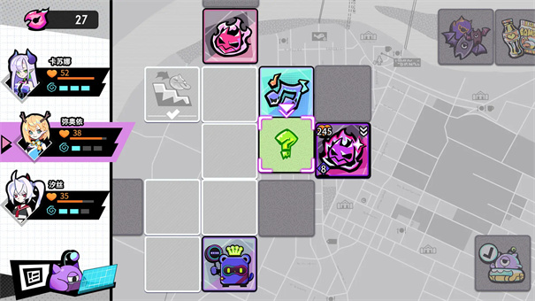 1、玩家以棋盘走格形式推进任务,每个格子隐藏随机事件(如强制战斗、扣血事件或空白格),需通过消耗技能点使用“望远镜”揭开迷雾,规划最优路线。