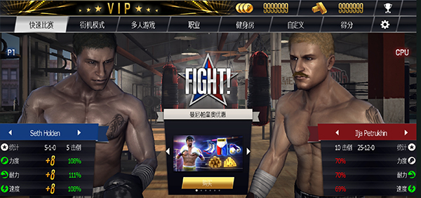 1、下载进入真实拳击游戏,左边将是你控制的人物,右边将是你的对手,你可以随意更换角色,选择好后点击FIGHT即可开始对战;