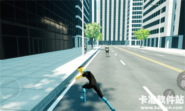 3、操控超级英雄在城市街道战斗,界面有移动轮盘和攻击、奔跑等功能按钮,可与敌人战斗并探索城市。