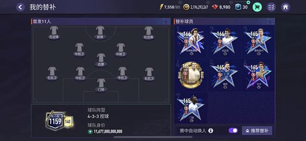 替补阵容同样星味十足,战神、巴拉克、丁丁、马特乌斯、梅西、卡卡、门迪,德罗巴放在另一个阵容(用下来现版本的德罗巴还是要比巴蒂强一些的,9阶后的巴蒂才是真正的战神)