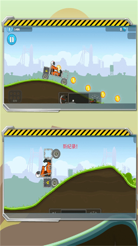 3、改造好赛车后就可以出发了,左边是刹车,右边是油门,如果车头翘起就刹车,车尾翘起就加速,我们要做的就是操作赛车在能量耗尽之前抵达终点,就是这么简单;