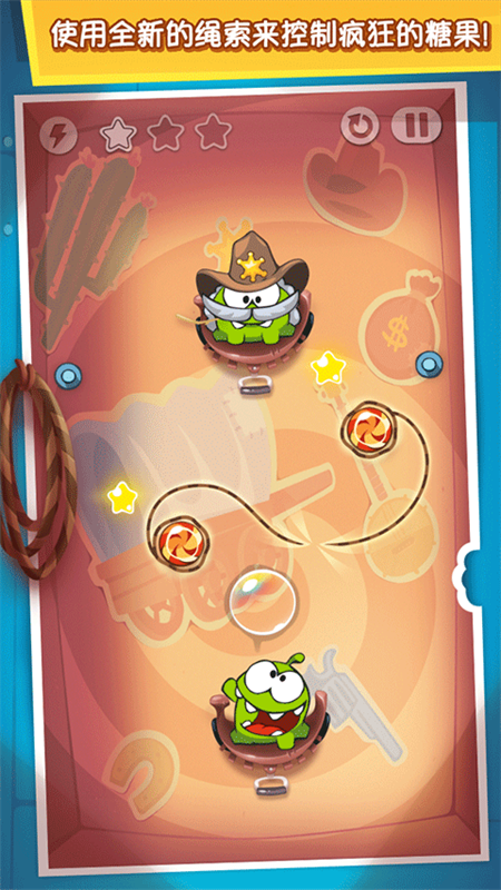 第三关与第二关同理,需要玩家掌握摆动的角度,首先切断右侧的第一根,在糖果触碰到星星的最高点立马切换上方的第二根,之后第三颗星星也就自然的收入囊中。