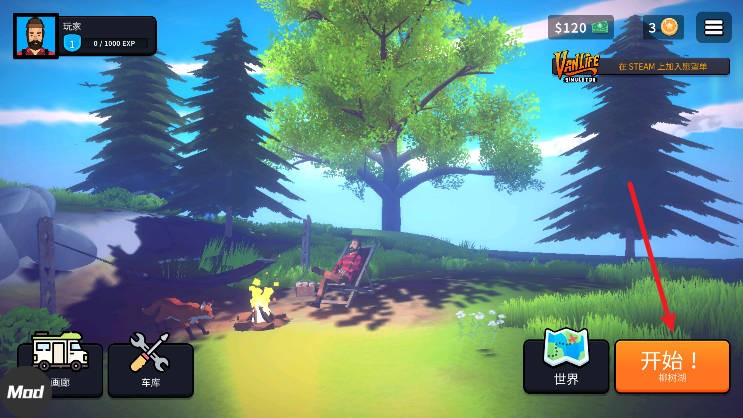 1、进入房车生活模拟器,点击右下角的“开始”按钮,就可以进入游戏了。