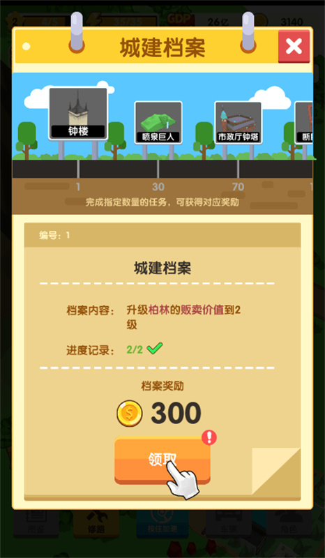5、完成订单,可以继续在城市区域点击领取奖励!奖励包含金币和城市发展度,金币能对城市或农村进行升级,城市发展度达到一定程度时可以将城市升星。
