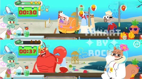 1、有众多你熟悉的角色在游戏中悉数登场,无论是厌烦工作的章鱼哥,还是可爱的海绵宝宝都会出现。