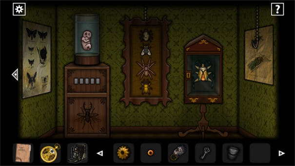 返回二图用钥匙打开带锁的房门(收藏房),进去,把上面的灯移动到右边,点开关开灯可以看见摆放顺序,按着顺序移动左边的物品,摆正确后会出现钥匙,拿走。