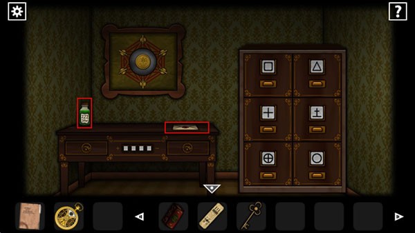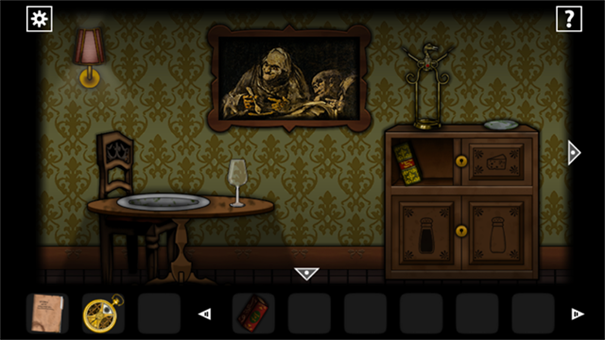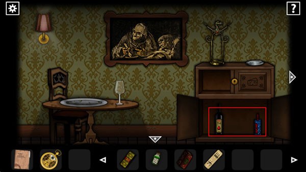 出来到右边的门(餐厅),拿走柜里的书,用钥匙打开下面的柜子拿走甜味剂和密封的酒,把酒放进柜顶的开瓶器,根据二图右边骷髅画上的眉毛位置以中中,上下,中上,下下,上上的顺序开瓶,摆好一次按一次红色按钮,拿走打开的酒,把安眠药水和酒倒进桌上的高脚杯里,获得一杯酒。