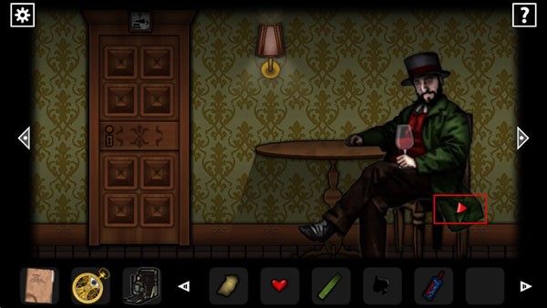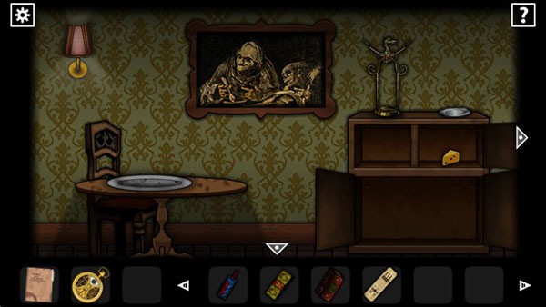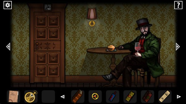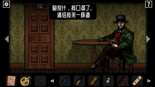 回到之前二图的收藏房,在右下角老鼠洞旁边放上捕鼠器和奶酪,退出房间,听见老鼠的惨叫,再进去可以拿到死老鼠,然后来到餐厅把老鼠放进柜顶开瓶器右边的盘子里可以得到死老鼠的菜肴,到右边放进烤箱里,根据右边柜子书上的提示制作,听见叮一声就烤好了,打开烤箱获得松脆小吃(也可以点击右上的问号提示通过),把小吃拿给那个人了,趁他喝下酒后沉睡的时机拿走他手上的齿轮和桌上的书,把齿轮放进金表里。