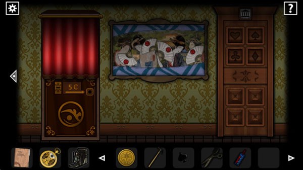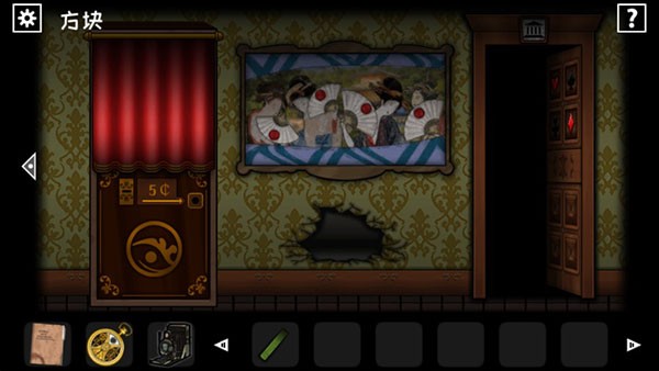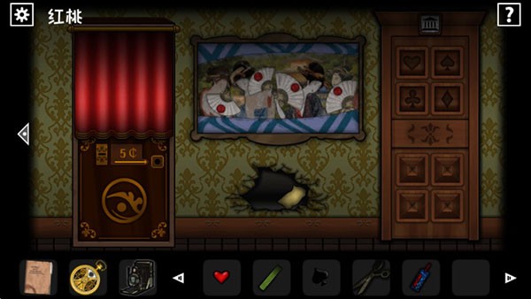 五图用相机观察,挂画下方有个红色的X,用锤子砸破后得到红桃和纸片。