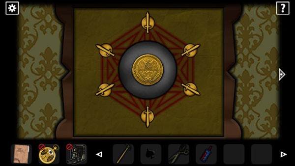 依旧是寝室,墙上有机关画,根据图书馆左边墙上的乌鸦可以知道要六把剑全部朝里,开始扭机关,左下角开始扭动剑,点击剑可以扭动剑头指向的方向那把剑,扭好后在机关中间获得硬币。