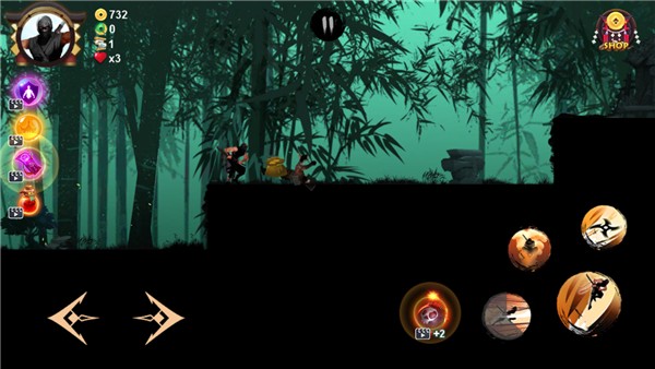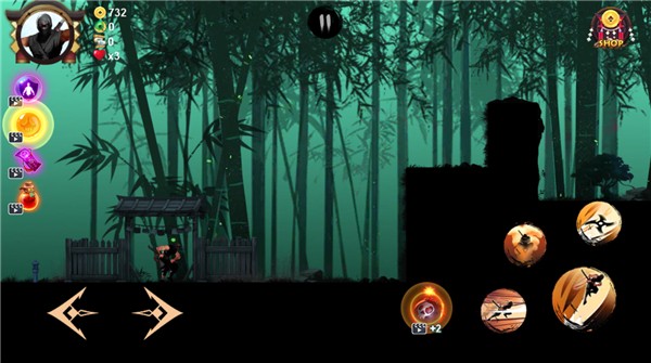 2、游戏操作界面左侧为左右移动控制,右侧则是跳跃、攻击、冲刺和隐身技能按钮。