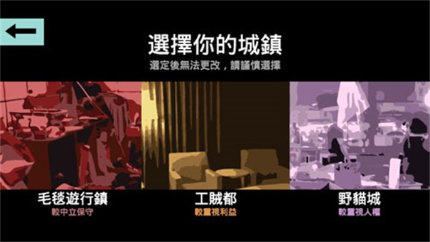 游戏开局玩家可从中立保守的阿玛拉,重视人权道德的艾玛,功利主义的矮额中挑选一名参与选举,不同的城市所侧重的元素也略有差异,而这些角色之间的唯一差异就是初始的道德、秩序和民意值不同,通过参与处理法律、认知、事件和经济可以让这些数值发生改变,而怎么改变,力度如何则就完全取决于玩家的决策了。