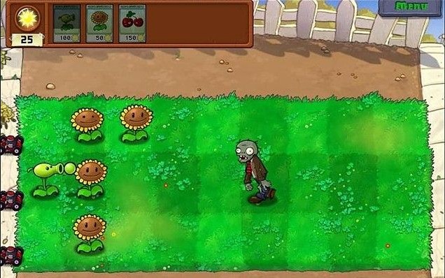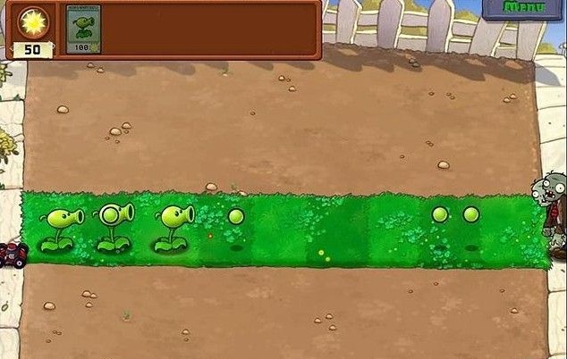 此关属于教程关,僵尸来路只有1条。收集太阳并种好豌豆射手就可以了,不过别把豌豆射手种在右边僵尸出现的地方自杀就可以轻松过关。