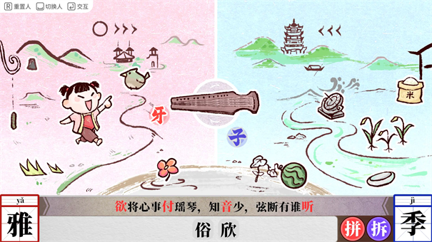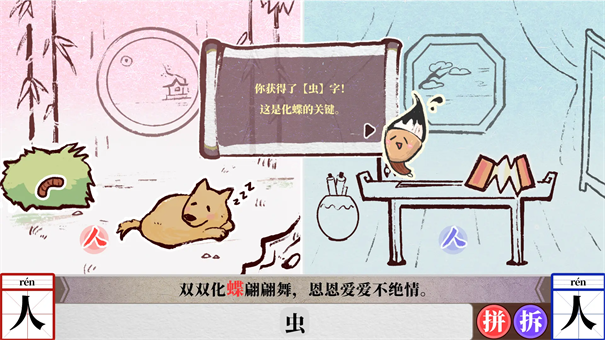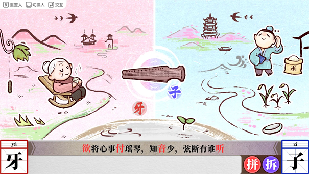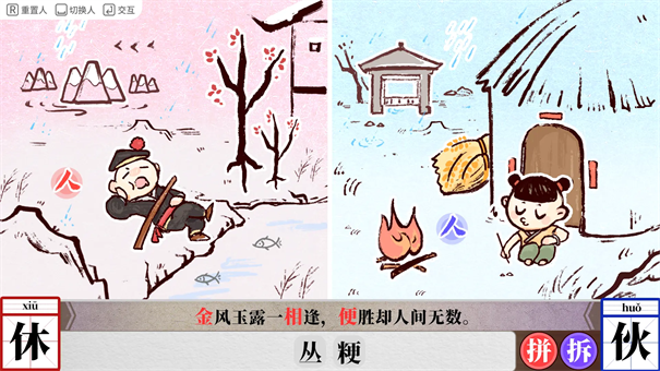 1、很有创意的一部游戏,主要玩法是通过交互组合收集汉字,组合汉字,然后通过拆字和合字,结合成诗句中的汉字。