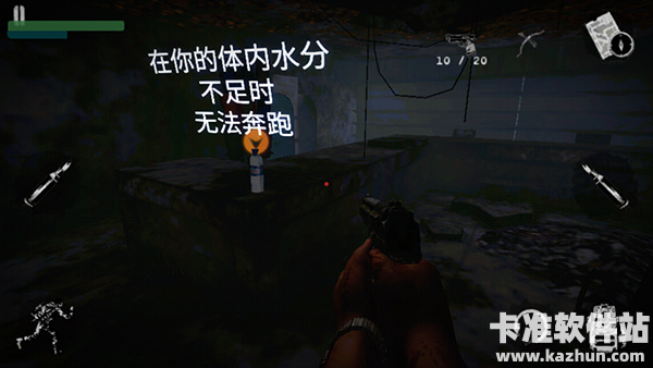 6、左上角是生命值和水分,当水分不足时无法奔跑;