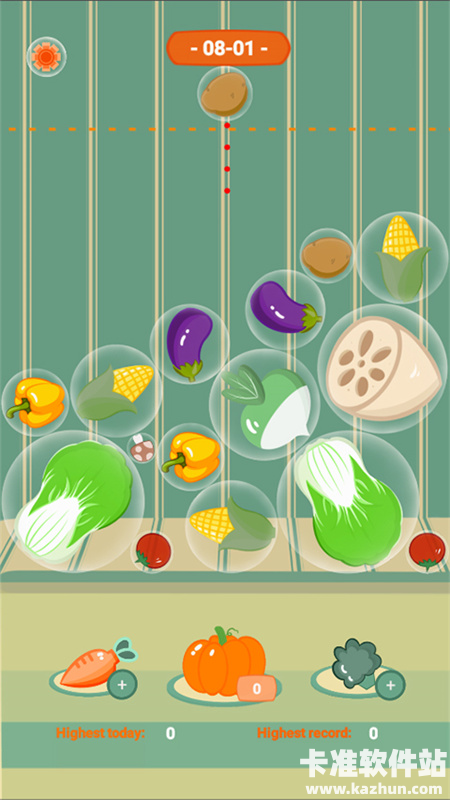 3、注意:因为各类蔬菜都被气泡覆盖,所以会流动,当相同的两个蔬菜碰撞,即可合成新的蔬菜品种。