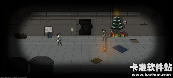2、创建角色后,进入一个昏暗的室内场景,环境中有圣诞树、暖气炉和地图等细节,两名角色在房间中探索,营造出神秘而紧张的氛围。