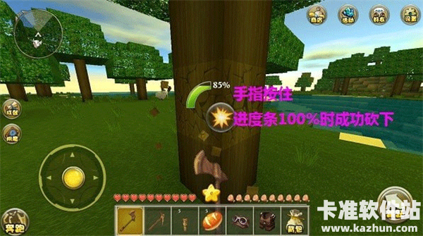 2、点击快捷栏上的斧子,拿在右手中,靠近一棵树干,手指按住树干上的方块,进度条出现,当进度条100%时树干被成功砍下。