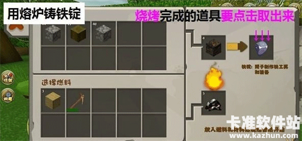 注:熔炉是通过制作台用石块合成的,熔炉不仅能烤食物,还能铸铁锭、将沙子烧成玻璃
