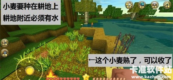 4、怎么种小麦?先做一把木锄(石锄也可),找到一片靠近水源的草地,右手拿着锄头点草地,即可变成耕地(耕地没有水会干旱)