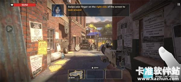 视角控制:按照引导滑动屏幕右侧调整视角,时刻扫描周围环境,避免被背后偷袭的僵尸包围。