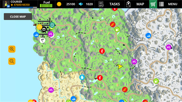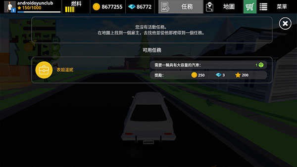 4、菜单栏上方分别为个人信息、汽车燃料、金币钻石、任务以及地图和商店,新手玩家可以先点击“任务”,根据提示完成任务,获得经验