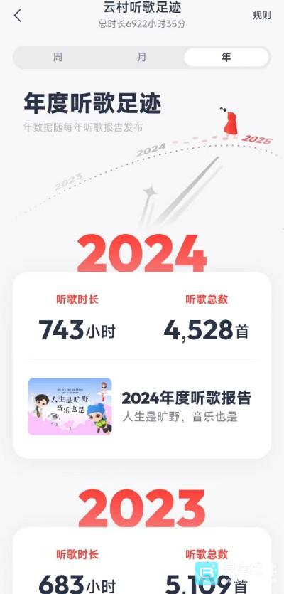 点进来后可以查看自己的周、月、年听歌足迹,切换到年听歌足迹,可以查看各个年份的年度报告