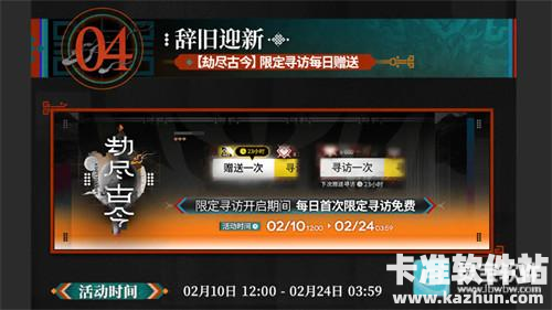 活动期间,玩家每日可在【劫尽古今】限定寻访中免费进行寻访一次