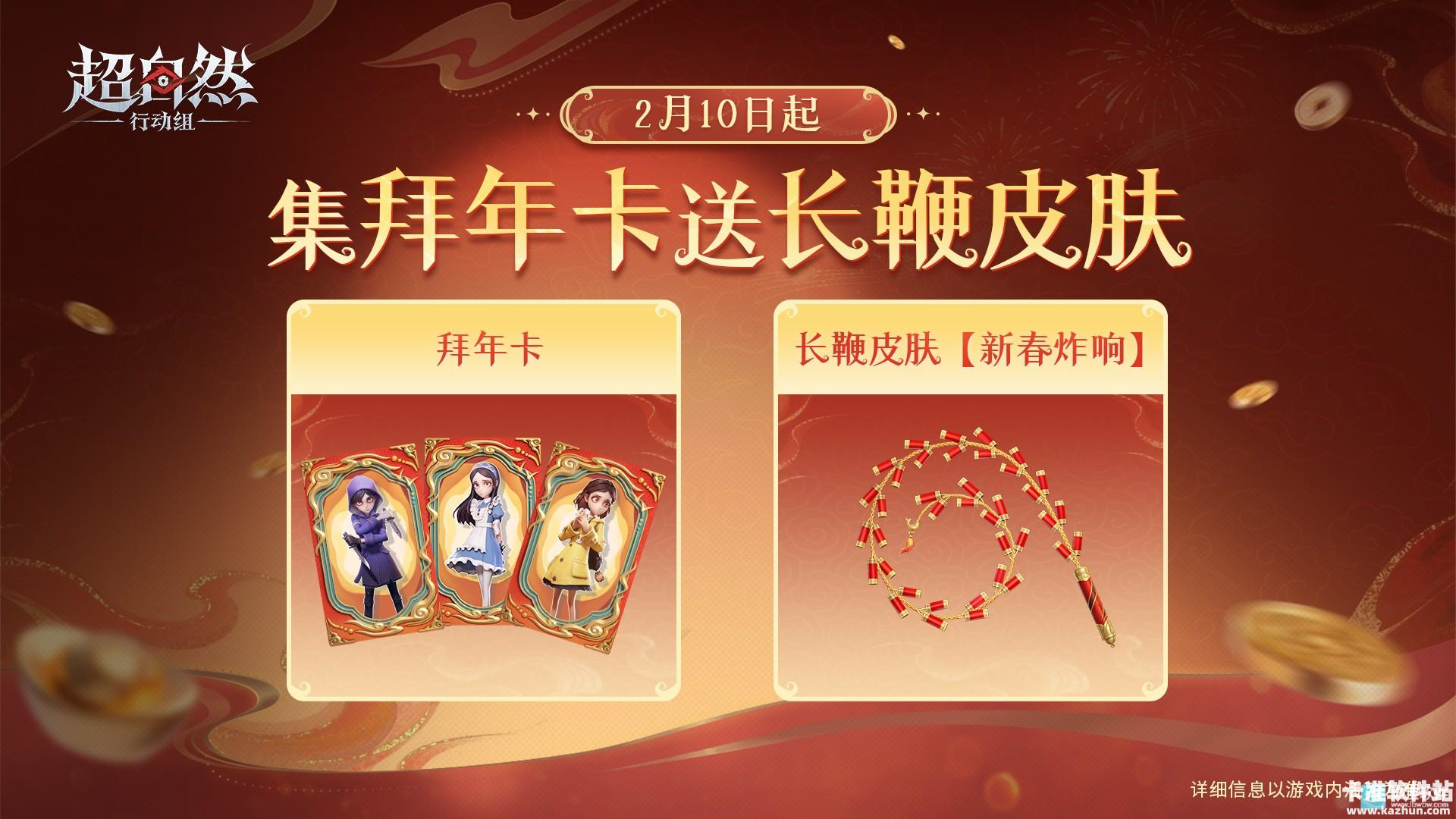 2月10日起,游戏内随机掉落限定回收物【拜年卡】,小黄、爱丽丝、零等13位员工为大家献上马年祝福,集齐即可兑换长鞭皮肤【新春炸响】!