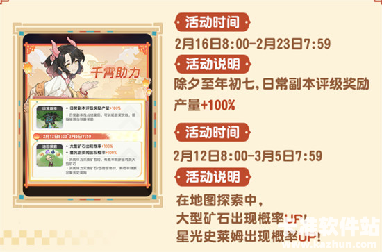 2、地图探索概率UP:2月12日8:00-3月5日7:59,地图探索中大型矿石、星光史莱姆出现概率大幅提升。