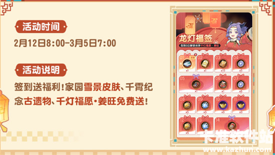 2、福利内容:每日签到可免费领取家园雪景皮肤、千霄纪念古遗物,还能直接获取千灯福愿・姜旺限定伙伴。