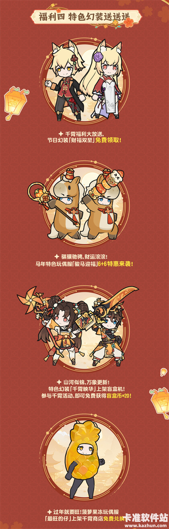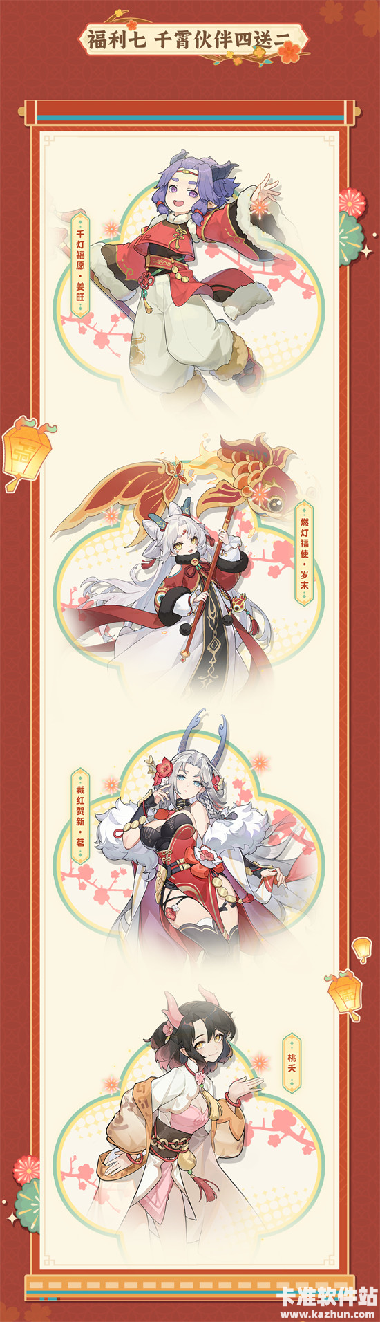 上线千灯福愿・姜旺、燃灯福使・岁末、裁红贺新・茗、桃夭四位限定伙伴,可自选其二获取(注:其中部分伙伴需通过礼包购买,68元/个)。