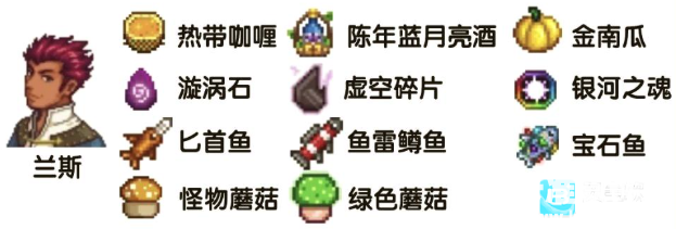 2、兰斯:陈酿蓝月亮、虚空碎片、热带咖喱、涡卷石、鱼类鳟鱼、华丽财宝箱、怪物蘑菇、匕首鱼、绿色蘑菇、银河之魂