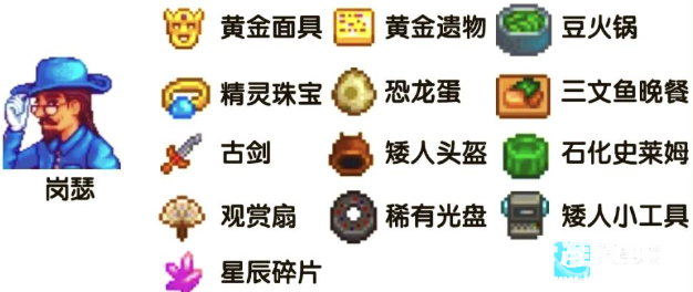 15、岗瑟:恐龙蛋、矮人小工具、黄金遗物、黄金面具、矮人头盔、稀有圆盘、装饰用扇子、精灵珠宝、鲑鱼晚餐、豆类火锅、石化史莱姆、古剑