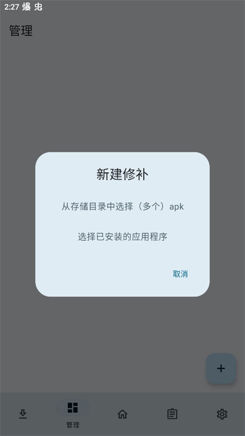 1、打开LSPatch免root版,进入后点击下方“管理”栏,再点击右下角的+号。