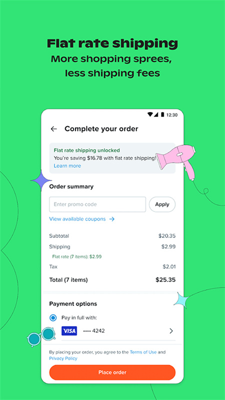 - 每天打开 Wish 应用程序即可获得每日登录印章。7 次访问可让您享受高达 50% 的折扣!