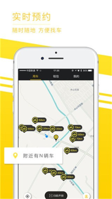 第一步:查看首页附近车辆位置,根据路线指引寻找觅马电单车,或点击车辆图标进行预约